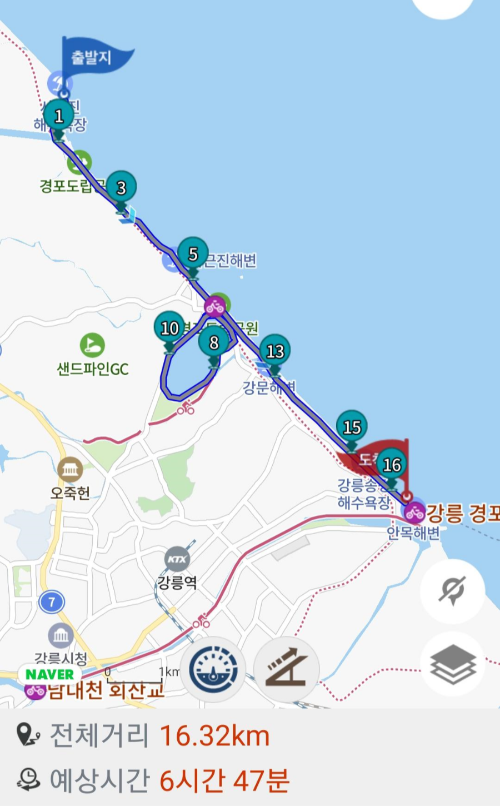 ▲ 언제/어디를/얼마나 : 2021년 10월 25일(일), 사천진 해변~순포해변~경포대(자전거)~강문해변~송정해변~안목항~(남항진 해변), 약 16.5km, 6시간 40분(걷는 시간 5시간 10분), 목요걷기팀과