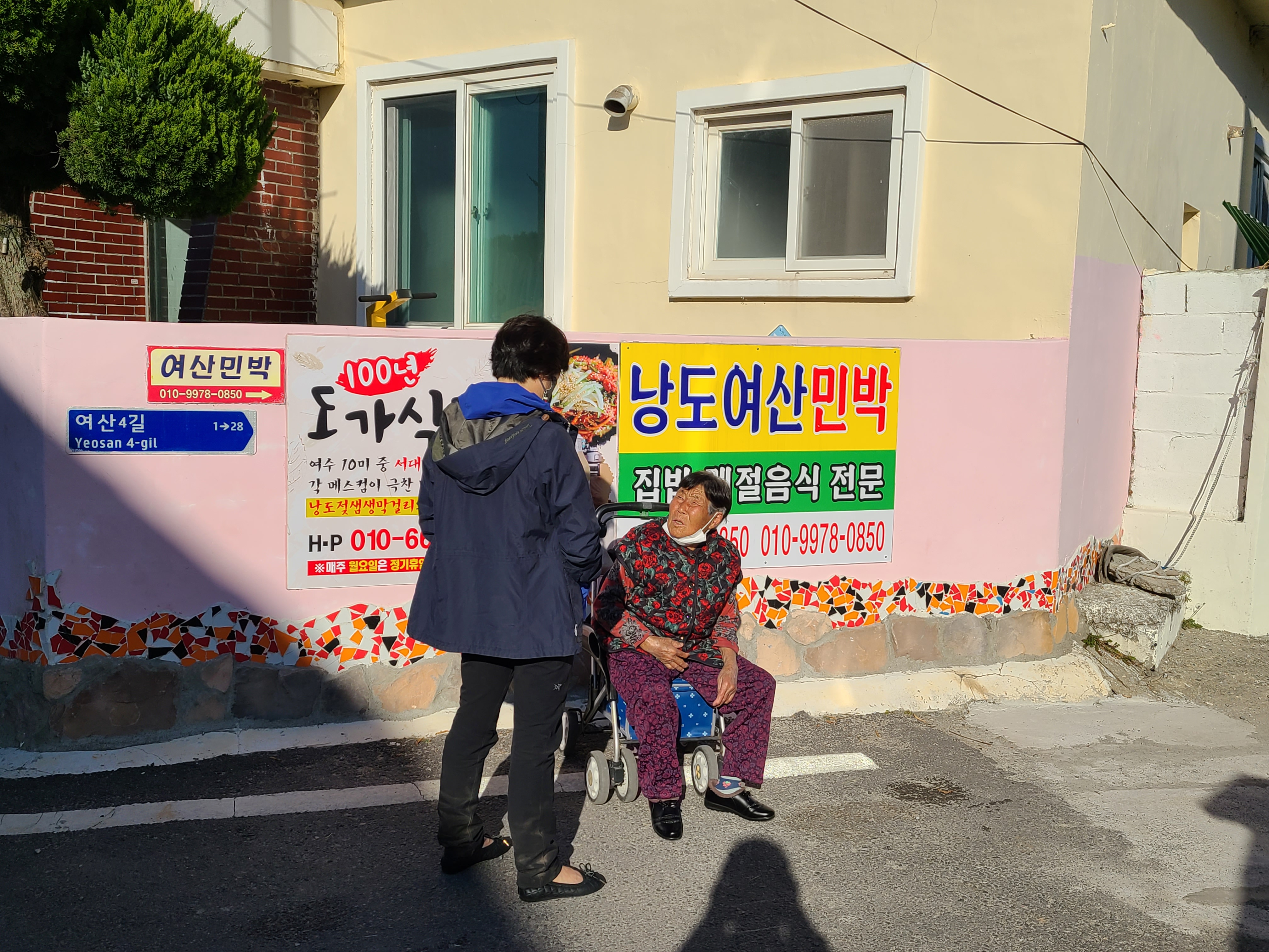 홀로 나와 있는 할머니에게 말을 거는 옆지기