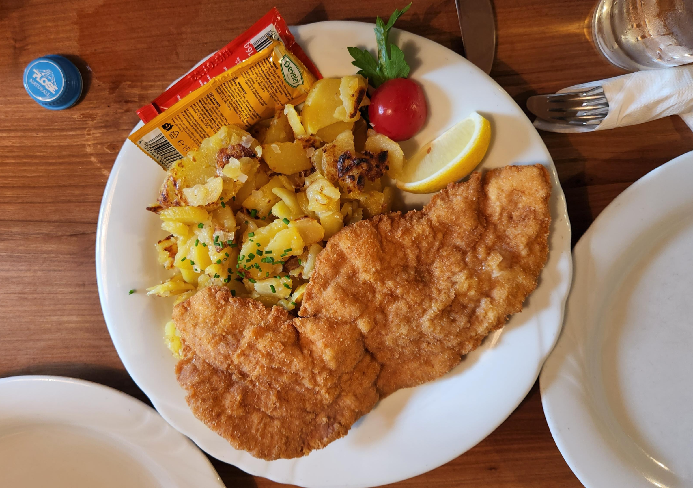 이탈리이식 돈까스(오스트리아 돈까스 슈니첼로 보임)에 구운 감자,