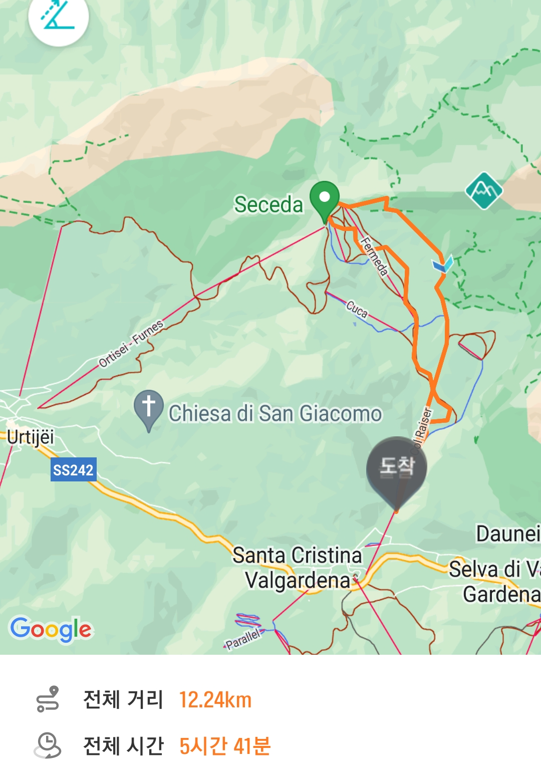 지도 좌측에 오르디세이(Urtijei)에서 세체다 정상으로 올라가는 케이블카 노선이 보인다